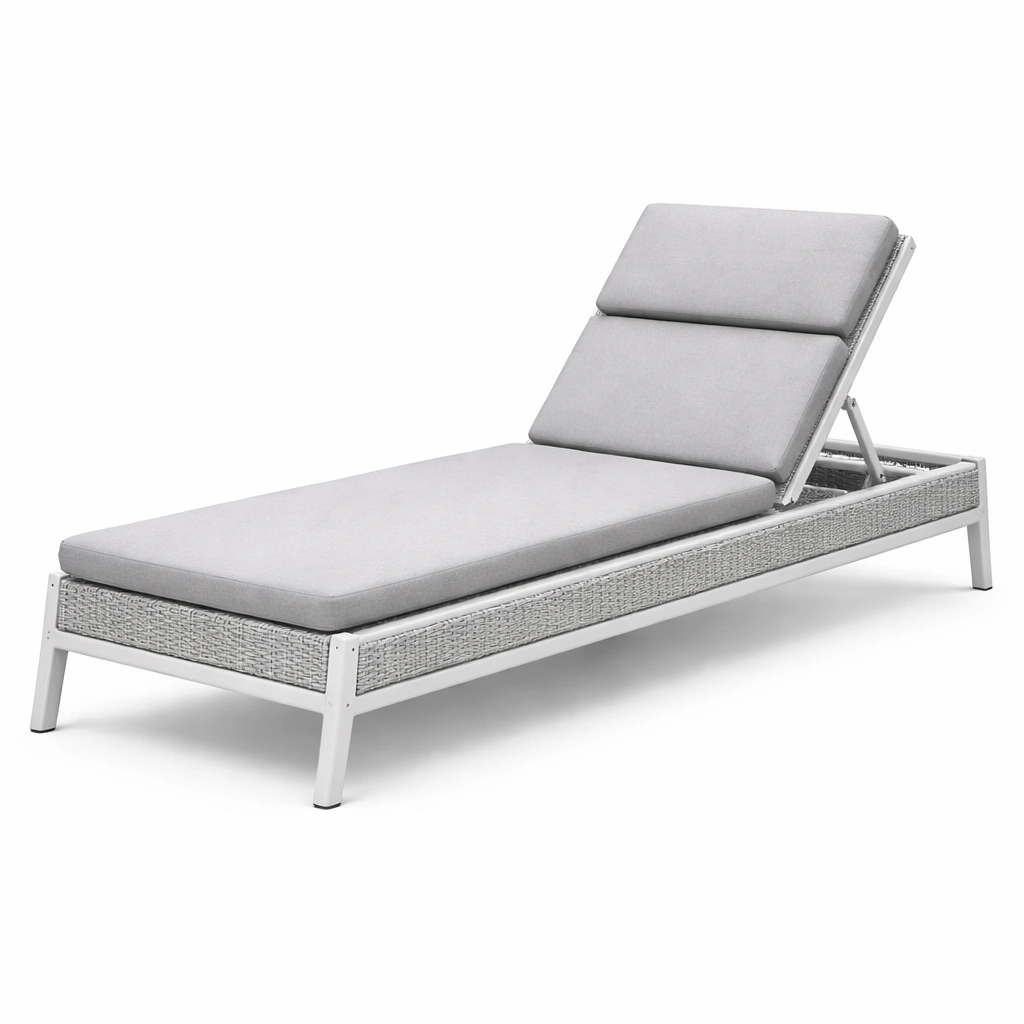 Tumbona de aluminio y ratán sintético gris con cojín de espuma