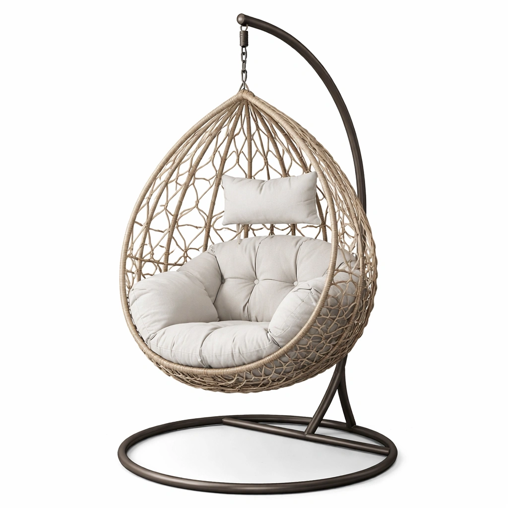 Silla colgante de ratán sintético beige con cojines y estructura metálica